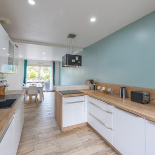 La cuisine ouverte américaine est entièrement aménagée et équipée.