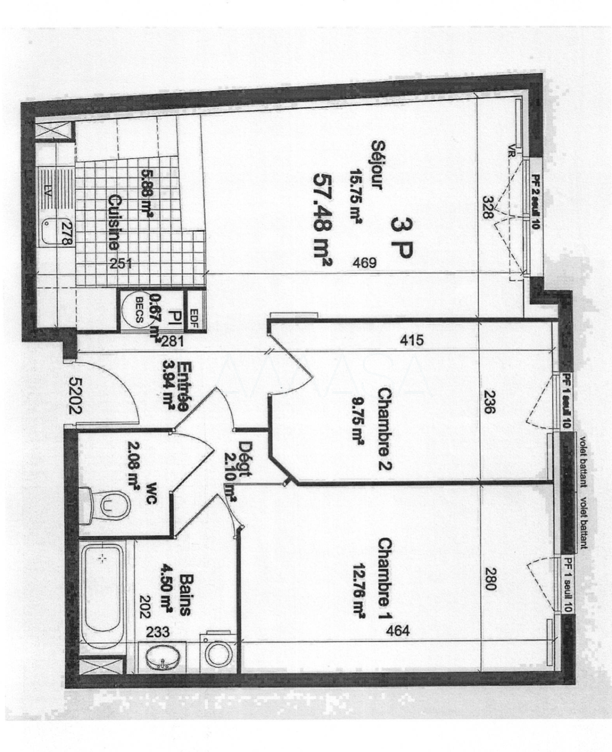 Un bel appartement de 3 pièces de 55,76m2, composé d’une entrée avec placard, d’un séjour donnant sur une cuisine aménagée, un dégagement desservant deux chambres, une salle de bain et un wc séparé.