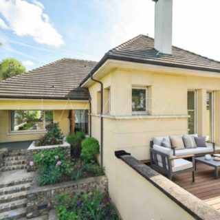 Maison contemporaine de plus de 400 m², avec ascenseur desservant un hall d’entrée et un rez-de-chaussée surélevé. Triple séjour cathédrale, cheminée, terrasse, salle à manger, bibliothèque ou bureau, cuisine ouverte équipée, cellier, WC, deux chambres avec salle de bains et douche, dressing, lingerie. À l’étage, palier, mezzanine, chambre avec salle d’eau, deux grandes pièces aménageables. Sous-sol total avec garage pour 4 voitures, buanderie, cave à vin, salle de jeux, local technique. Chauffage gaz, climatisation. Excellente localisation et état.