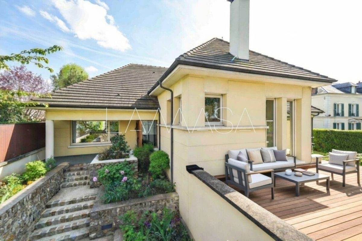 Maison contemporaine de plus de 400 m², avec ascenseur desservant un hall d’entrée et un rez-de-chaussée surélevé. Triple séjour cathédrale, cheminée, terrasse, salle à manger, bibliothèque ou bureau, cuisine ouverte équipée, cellier, WC, deux chambres avec salle de bains et douche, dressing, lingerie. À l’étage, palier, mezzanine, chambre avec salle d’eau, deux grandes pièces aménageables. Sous-sol total avec garage pour 4 voitures, buanderie, cave à vin, salle de jeux, local technique. Chauffage gaz, climatisation. Excellente localisation et état.