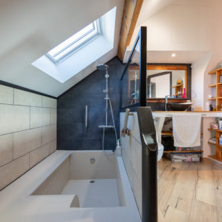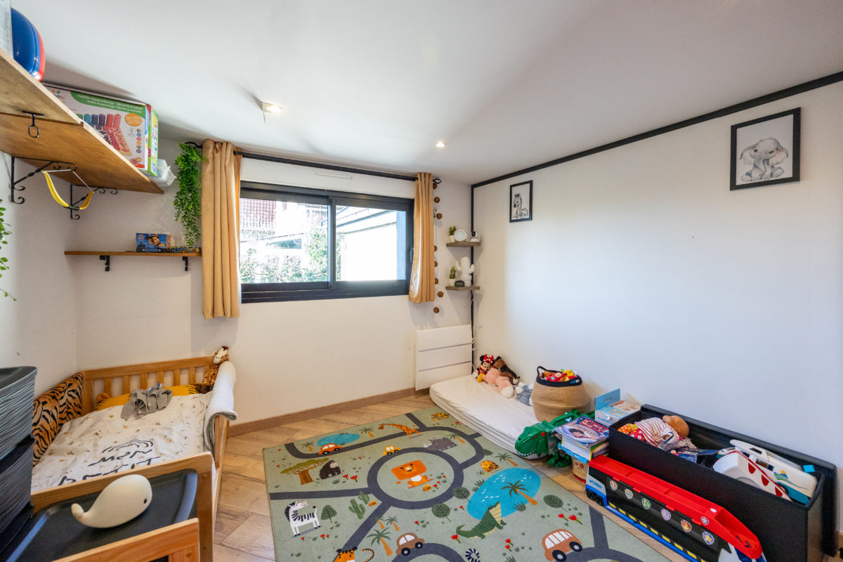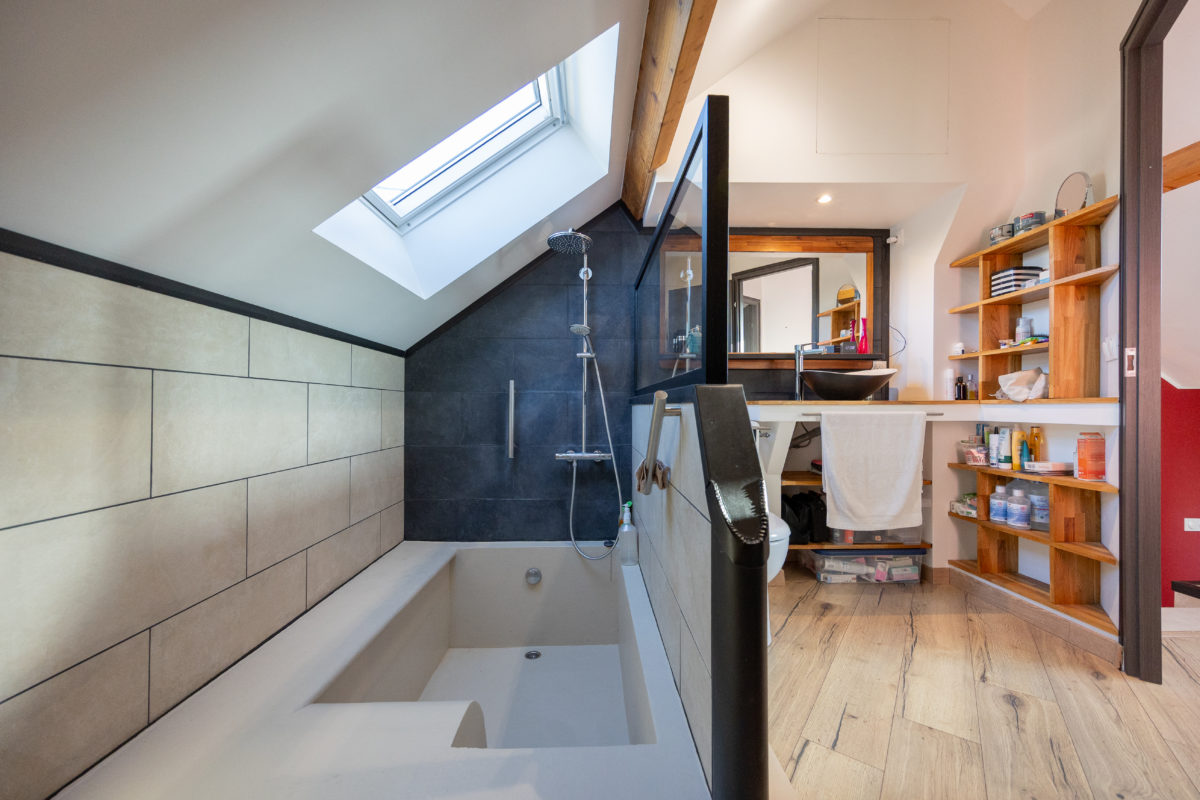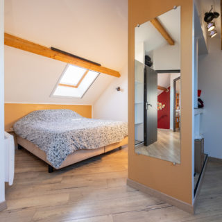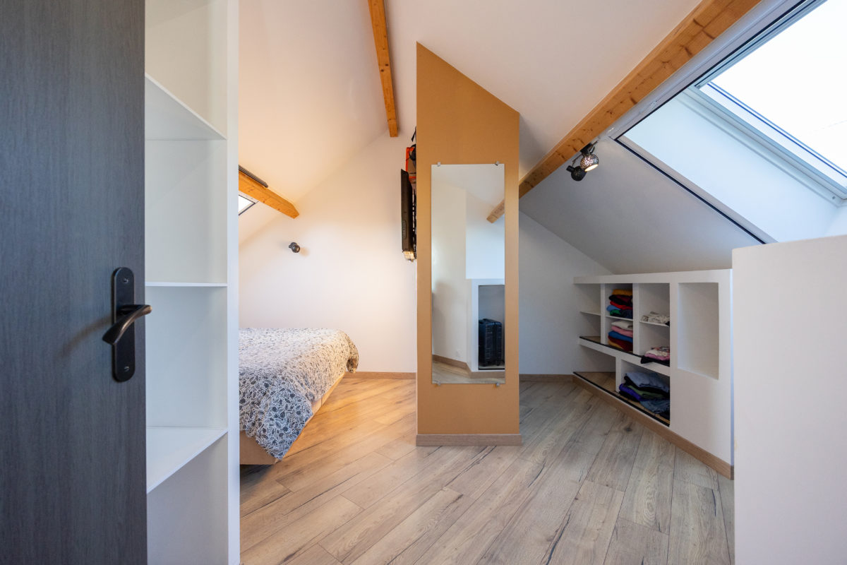 A l’étage, deux chambres dont une avec dressing et une salle de bains avec wc. Le chauffage est mixte, avec un système au sol en rdc et des convecteurs, et un conduit de cheminée est déjà en place.