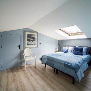 A l’étage, 1 grande chambre avec salle d’eau et wc.