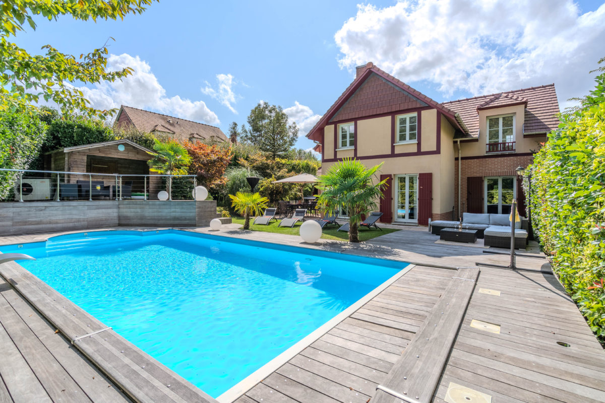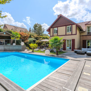 Le jardin paysager accueille une piscine chauffée de 4 x 12 m, une terrasse et une cuisine d’été, offrant un espace extérieur idéal pour la détente et la convivialité.