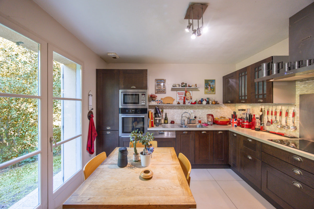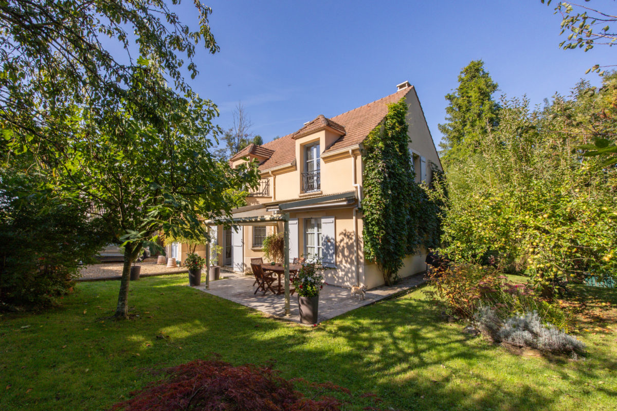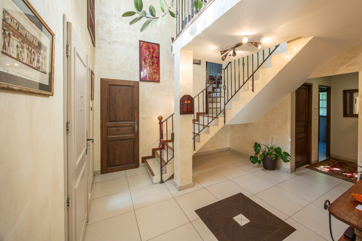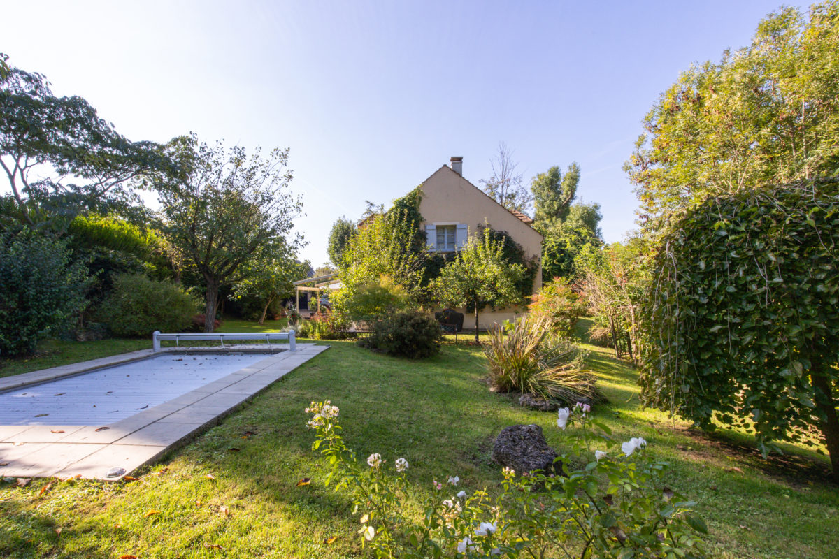 À l’extérieur, le terrain de 1169m2, arboré et sans aucun vis-à-vis, profite de plusieurs expositions et d’une belle intimité, avec une piscine chauffée et une terrasse spacieuse.